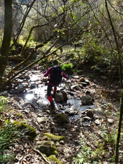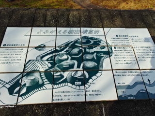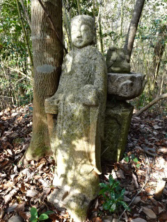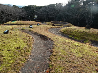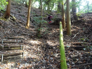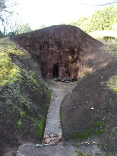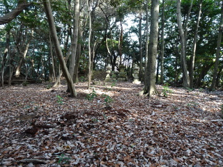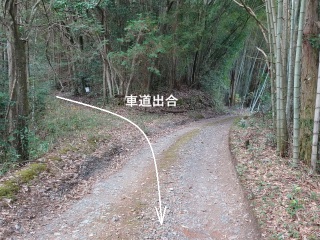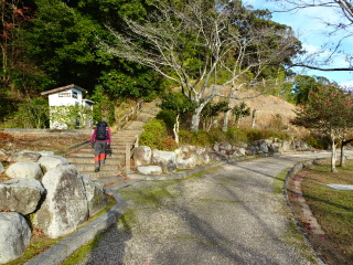 | 一旦山道に入り、左の階段を登って行くと秋葉様がある。歩行者・自転車専用道路を通り、朝田墳墓の下のトンネルを通り、 その先から左の道を降りて行く。暗渠を潜ると弓道場の駐車場へ戻ってくる。 |