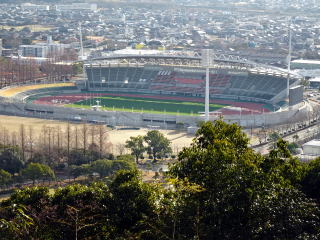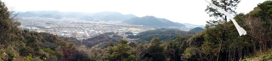 | 車道を降って振り返ると、金山の展望所の白い四角の布が見える。 山口・宇部道路の手前の側道を登って行くとベンチがある。 |