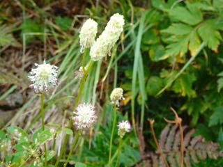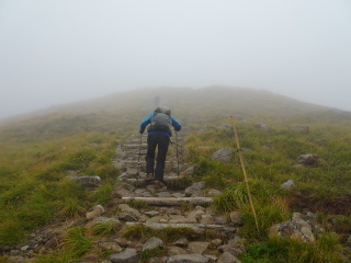 | 牛首から巻き道を下山する。相変わらずガスって遠景は良く見えない。半分の距離の標識を過ぎて降って行く。以前来た時は この辺りは雪で覆われていた。 |