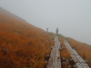 | 姥ヶ岳の道は良く整備されていて歩きやすい。約25分で姥ヶ岳山頂に着く。木道をぐるりと回ってみたが何も見えない。 すぐに月山へ向う。 |
