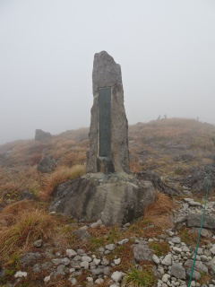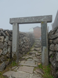 | 松尾芭蕉の「曇の峯いくつ崩れて月の山」の石碑辺りから平になると、山頂小屋がガスの中から現れる。 |