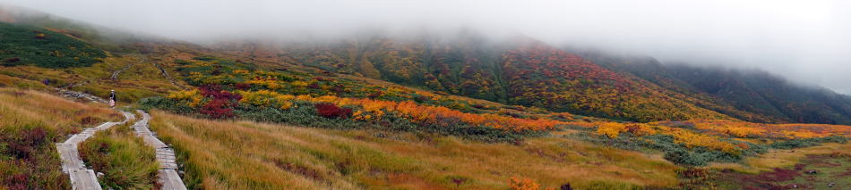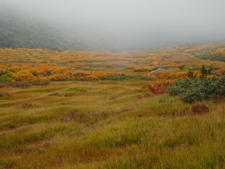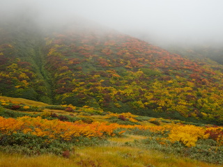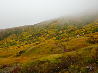 | 志津(姥沢小屋裏)口コースと、リフト乗り場分岐を過ぎると徐々にガスが取れてきた。稜線や山麓の紅葉が現れる。 |