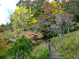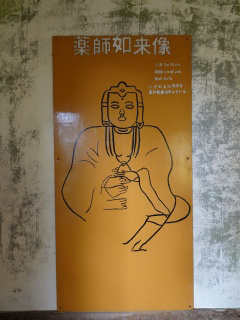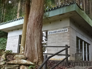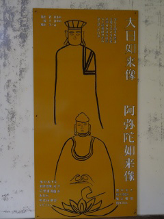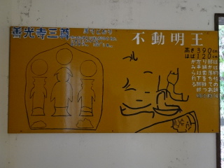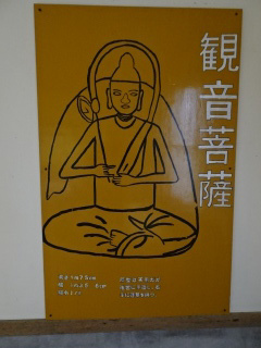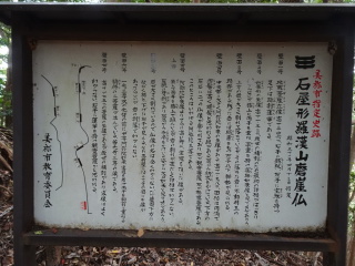 良く整備された石段を登って行くと中腹に休憩所がある。中の壁には磨崖仏の説明板が貼ってある。