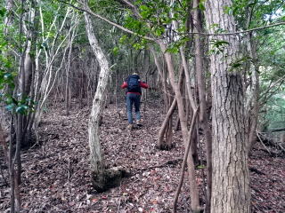 鹿ネットを左に曲がり降って行く。鹿ネットを跨ぎ尾根を巡ると鞍部に降る。