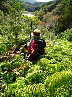 降る。正面には白岩山が見える。羊歯の茂る足元には中電巡視路のプラ階段がある。