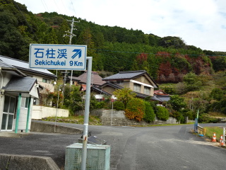 の道は辞めて林道を行く。石屋形集落を過ぎて、県道267号線に出た所には集会所と石柱渓の標識がある。