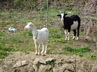 | 庚申石碑、勲七等佐々木秀衛君の石碑等を眺めながら、石屋形羅漢山入口に戻って来たらヤギが待っていた。 |