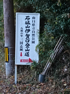 伊賀登山口には数台駐められる駐車場がある。急な坂をつづら折りに登って行くと、やがて石城山が見える。