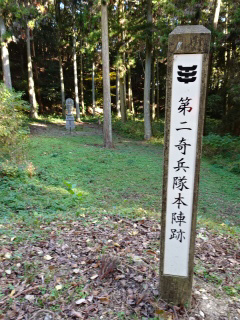 分岐があり、その前方に第二奇兵隊本陣跡の標柱と説明板がある。