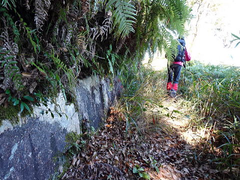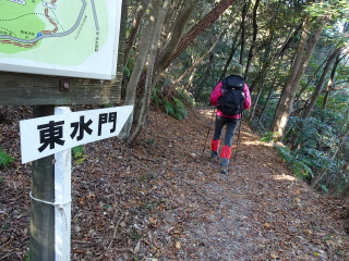 分岐を鋭角に左の東水門に向うと1400年前に作らえれた神籠石のある道になる。東水門を通り登って行くと・・・