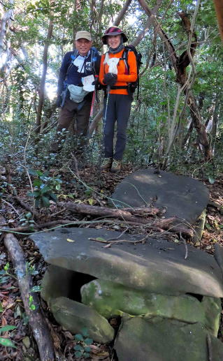 金光先生の声掛けで長門市の低山を歩きました。今回の先生の目的は配水池のある三上山と、国土地理院の地図上の三上山の場所を確認する事です。先生は山口県の山名を出来るだけ正確に後世に残したいとの思いがあります。山名は時代が変わると、又は見る方向の集落によっても変わるのは仕方がないものの、山名の読み方の間違いと、明らかに誤記で記載されているものは訂正したいとの思いがあります。例えば山口市徳地の狗留孫山543,8mの国土地理院の地図の表記は間違いで、正確にはその山名は鷲か嶽です。(既に地元の看板は訂正されているようですが、近く先生達のご尽力で国土地理院の地図も訂正されるとの事ですが、まだ確定はしてないようです)地元の方に確認したところ配水池のある山が三上山と教えて頂き、国土地理院の地図上の山名は分からないとの事でした。私のHPでは(偽)三上山としました事を御了承ください。また(偽)三上山のピークの一番高い所を山頂としました。途中古墳や石棺や山城らしき跡もあり、里山歩きの楽しさを満喫した一日となりました。