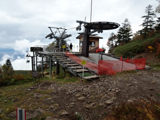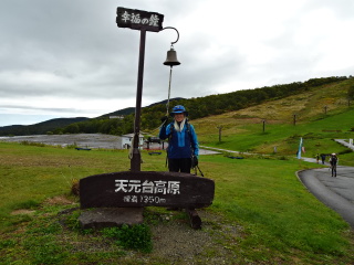 | 目が覚めると米沢は雨が降っている。雨だと登らないという相方をなだめて西吾妻山に向う。不思議な事に西吾妻山に向うと雨が 止み、一部青空がのぞいている。8時発のロープウェイに乗って天元台高原に着く。幸福の鐘を鳴らしてリフトに乗り込む。 |