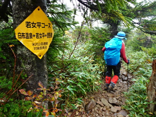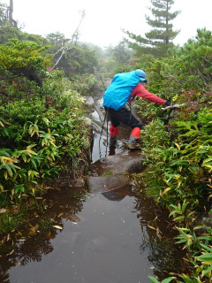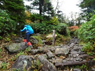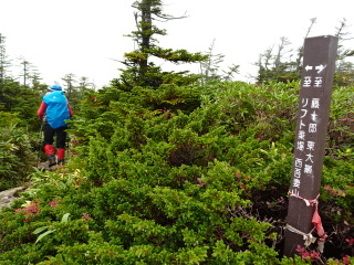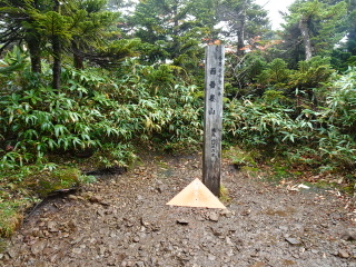 | 雨が降ったので登山道は小川のようになっていている。笹道を緩やかに登って行くと、西吾妻山の標柱が立っていた。 |
