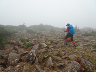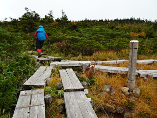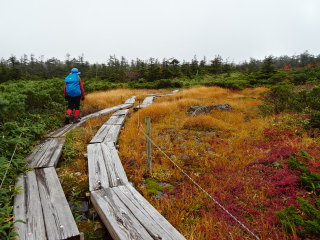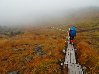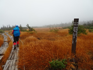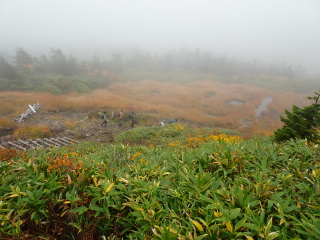 | かもしか展望台からの道と合流して南に降って行く。ガスって風景が良く見えないが湿原を進んで行く。 |