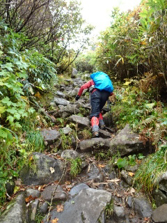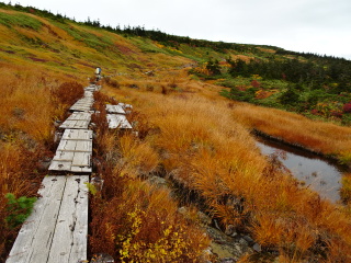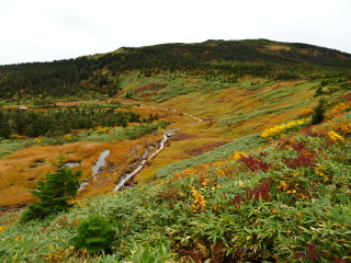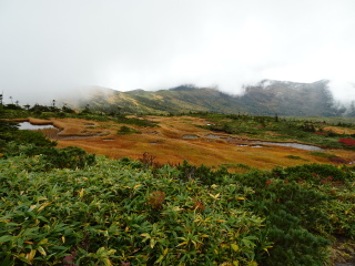 | 登りの時にはガスって良く見えなかった湿原帯を登って行く。 |