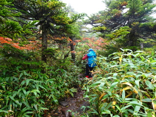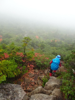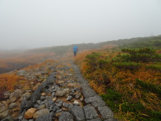 | 分岐を人形石へ向う。人形石は生憎のガスだが天気が良いと東大巓から一切経山や、継森から中吾妻山の雄大な景色が望める ようだ。 |