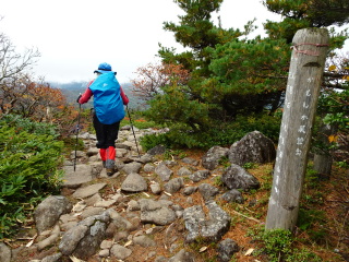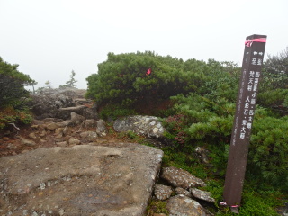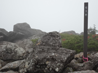| 岩場を登ると一番高い所に梵天岩の標識がある。この辺りは岩稜帯で天狗岩とも一帯になっていてガスっていると迷いやすい。 標識を見つけて南に降って行く。 |