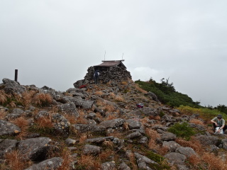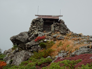 | 西吾妻小屋にはトイレもある。小屋周辺で食事をされている人が多いので、少し先の天狗岩で食べることにする。 天狗岩には吾妻神社が祀られている。 |