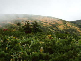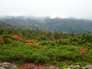 | 西吾妻山も一瞬見えてまた隠れたが、ラッキーな事にとうとう雨は降らなかった。下山時はガスが取れて素晴らし景色を見せて くれた。 |