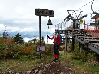 | ロープウェイ、リフトを乗り継ぎ約50分の空中散歩を終える。リフト終点の北望台で安全の鐘を鳴らして出発だ。 |
