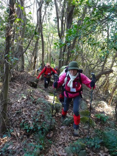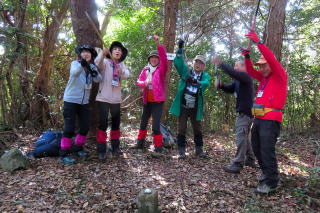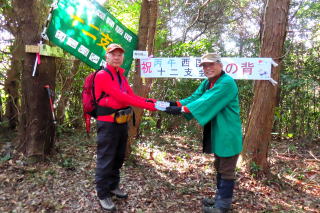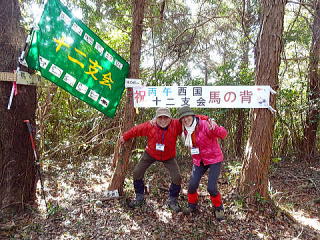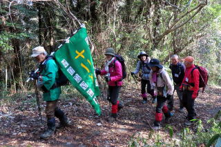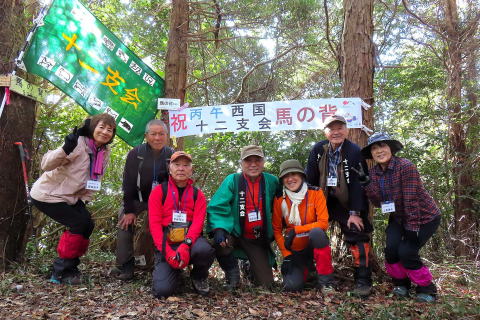 西国十二支会で今年の干支山の馬の背に登りました。年男の私は法被を着て、十二支会の旗を持って先頭を歩きます。山友さん達七名でワイワイガヤガヤ、和気あいあいの山行となりました。馬の背で万歳三唱(ストックを持って万歳と叫びながら、天に向かって三回ストックを突き上げる儀式)をして、記念写真に納まり、年男の記念品を頂きました。楽しいランチタイムでは、今年の抱負や近況を話したり話題が尽きません。最後にヤッホー三唱(来年の干支山の方角に向かって、ストックを持ってヤッホーと叫びながら天に向かって三回突き上げる儀式)をして山頂を後にしました。楽しきかな山、嬉しきかな友。