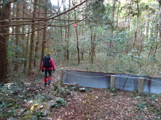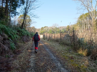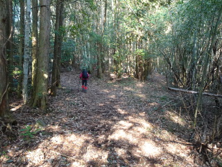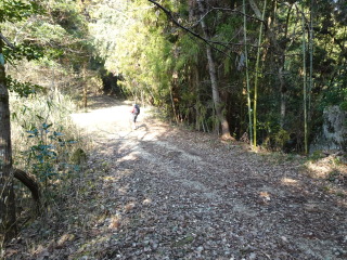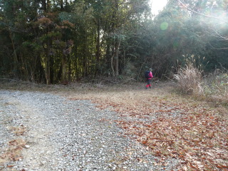 やがて山道に出て、すぐの分岐を右に曲がると林道に出合う。林道を左に曲がり緩やかに登って行く。しばらく行くと、広い所に