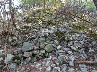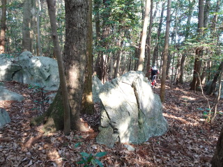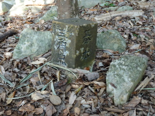 平坦な林道を行くと分岐するが左に進む。あとは一本道やがて小岩が積まれた小山が二ヶ所ある。何だろうかと思ったがすぐに