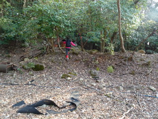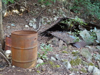やがて林道終点になり、左手には採石場の跡がある。ここから山道に入ると潰れた小屋やドラム缶が転がっている。