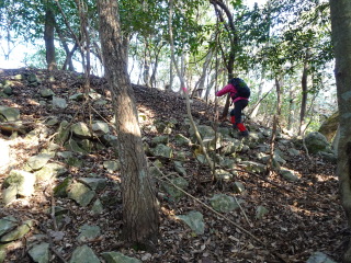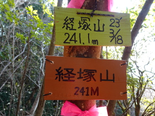 左手には採石場の跡が見える。一旦降り登り返すとすぐに経塚山に着く。