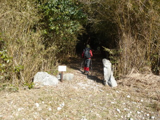 遊歩道終点からは山道に入る。すぐに林道に出るので左に曲がる。緩やかに降って行くと右手に広い路肩がある分岐に着く。