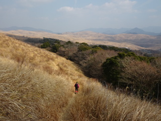 秋吉台の雄大な景色を眺めながら降りて行く。御鉢山の手前を右に曲がり降って行く。