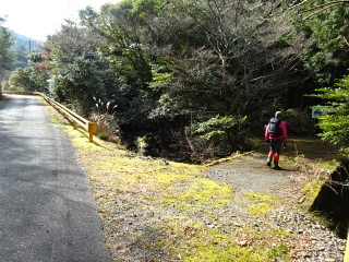 | お地蔵さまが安置されている広い駐車地に駐めて、林道白滝線を少し南(上流)に登って行くと右手に橋がある。 橋を渡り右に登って行くと、やがて林道終点になる。 |