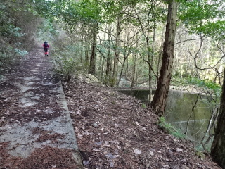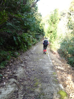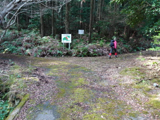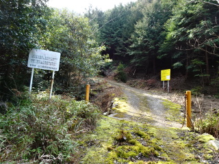 | しばらく降って行くと道が分岐する。右の道を行くとテープがあるが、左に一直線のコンクリートの側面が見える。分岐まで引き返して 斜面を上がると、立派な舗装道がつづいている。水源林造成事業で出来た道と看板に書いてある。 |