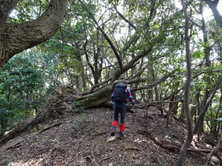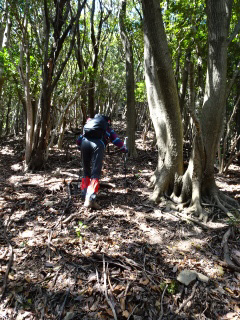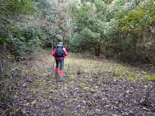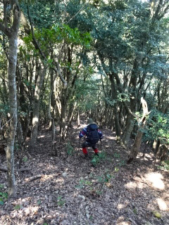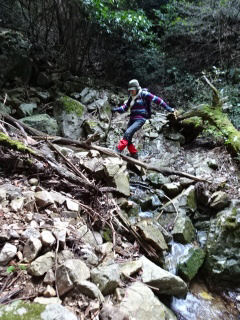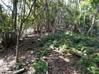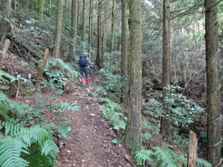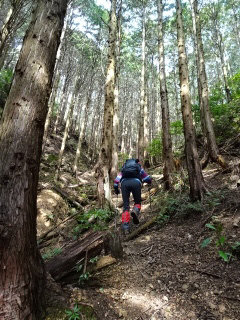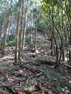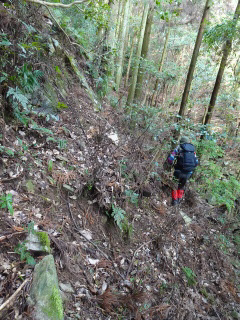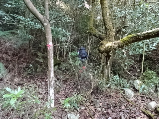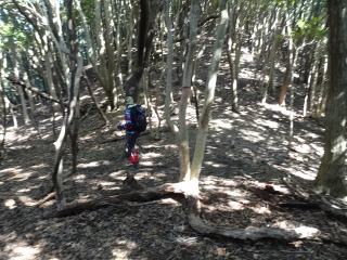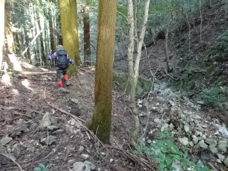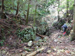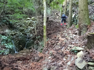 | 鞍部から谷沿いに降りる道は「防長山野へのいざない」で紹介されている。このルートは途中で倒木や道が潰れているが、 基本的には谷に沿って歩きやすい所を慎重に降って行けば良い。 |