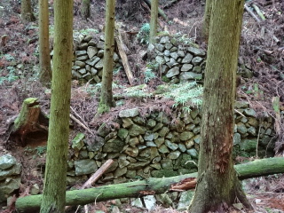 | 突然道が消える。よく見ると谷に降りる薄い踏跡がある。ここが斜めで細い、気が付くと一回転して転けていた。とっさに木を つかんだのか、大事に至らなかった。沢を渡り谷筋を登って行くと、石組の上に大きな炭焼き跡がある。 |