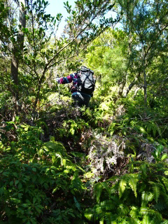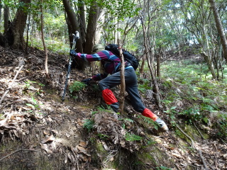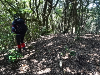 | 滑りやすい斜面を登って行く。今度は高さがあるので滑るとただでは済まない。やっとこさ支尾根に上がる。 支尾根から南西(左)に登ると縦走路に出合う。 |