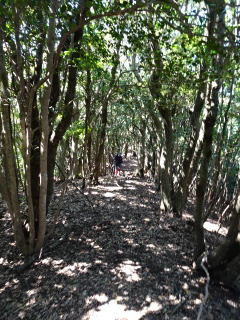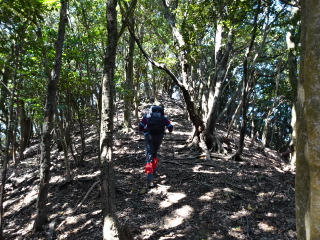 | 南(左)に急坂を登って行く。ピークを三つ越えると鶴羽山に着く。 |