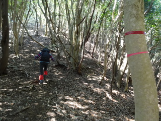 | 標高点381を過ぎて、その先のピークを左に降って行く。鞍部に降りると二重テープがあり、下山はここから谷を降りる事にする。 |