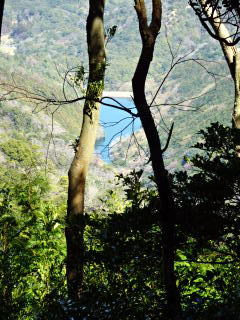 | 急坂を登って行くと、右手の展望が枝越しに開けて牛が迫の湖面が望める。枝のうるさくなった尾根を登って行くとザレ山に着く。 |