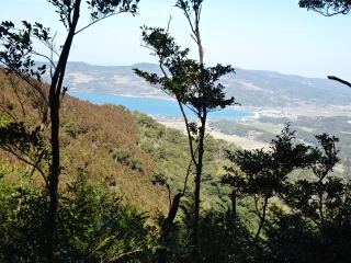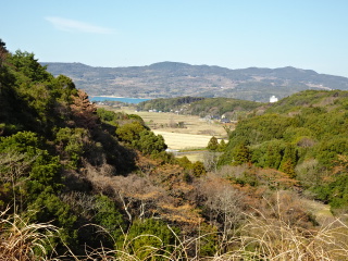 | ザレ山は保護石で囲まれた三等三角点がある。少し降りてみたが展望はない。三角点の周りを綺麗にして下山する。 途中で先程見えていた牛が迫の湖面の辺りから向津具半島と油谷湾が望める。 |