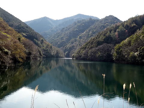 | 牛が迫堰堤の湖面には逆さザレ山が映る。反対をには向津具半島が望める。駐車地まで戻りお地蔵さまに安全登山の感謝をして、 黄波戸温泉交流センターで汗を流し、今夜の宿道の駅センザキッチンで車中泊をした。 |